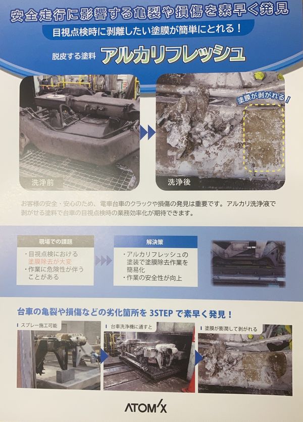 台車の亀裂や損傷などの目視点検における塗膜除去の簡易化に寄与します。