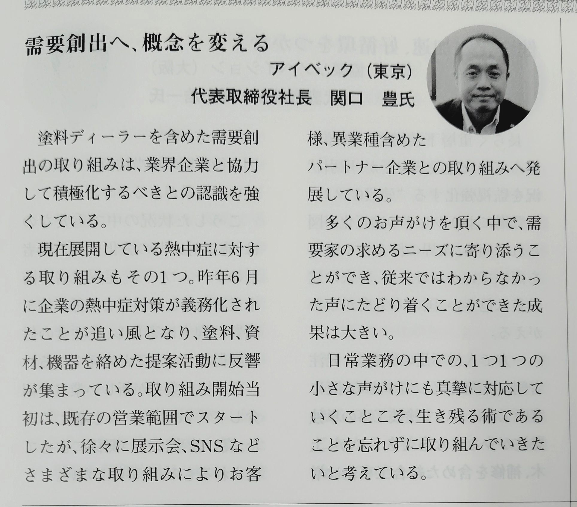 新着情報 2026.01.07ペイント&コーティングジャーナルに記事が掲載されました コーティングメディアさん発行の 【ペイント&コーティングジャーナル】にて インタビュー記事が掲載されました。 「需要創出へ、概念を変える」 需要家の求めるニーズに寄り添う会社を目指します。 ≪ 前の新着情報へ 次の新着情報へ ≫ 新着情報一覧 ≫